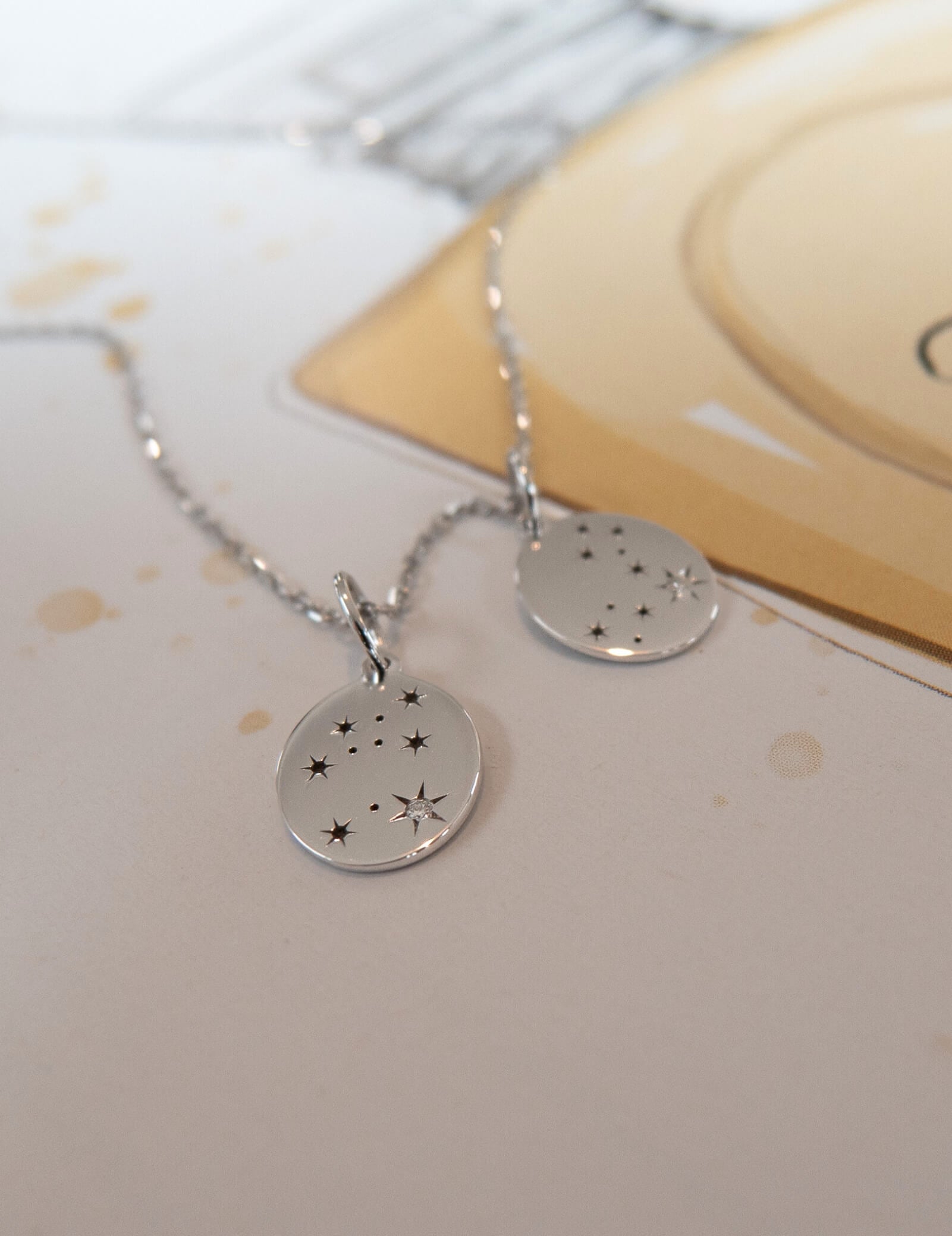The pendant represents the constellation pattern, crafted from solid 9K white gold with a single white diamond marking the Regulus star.